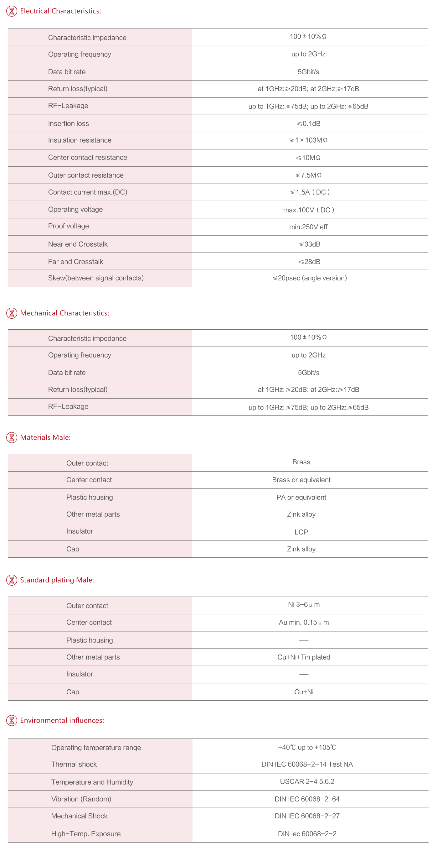 電器性能阻抗100Ω,頻率范圍DC-6GHZ,回損≥20dB(DC-1GHZ), ≥17dB(1GHZ-2GHZ)。